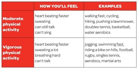 Examples: Fast walking, swimming, running, fitness classes and playing sport.