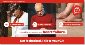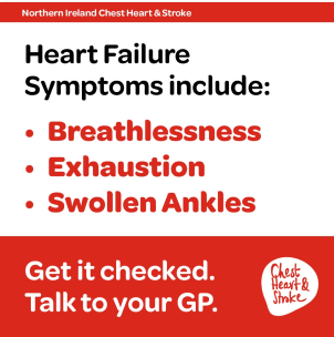 ![]() | Experiencing unexplained breathlessness? It could be a symptom of heart failure. The most common symptoms of heart failure are: Exhaustion Swollen ankles If you have any of these symptoms, get it checked by your GP. For more info visit www.nichs.org.uk/heartfailure |